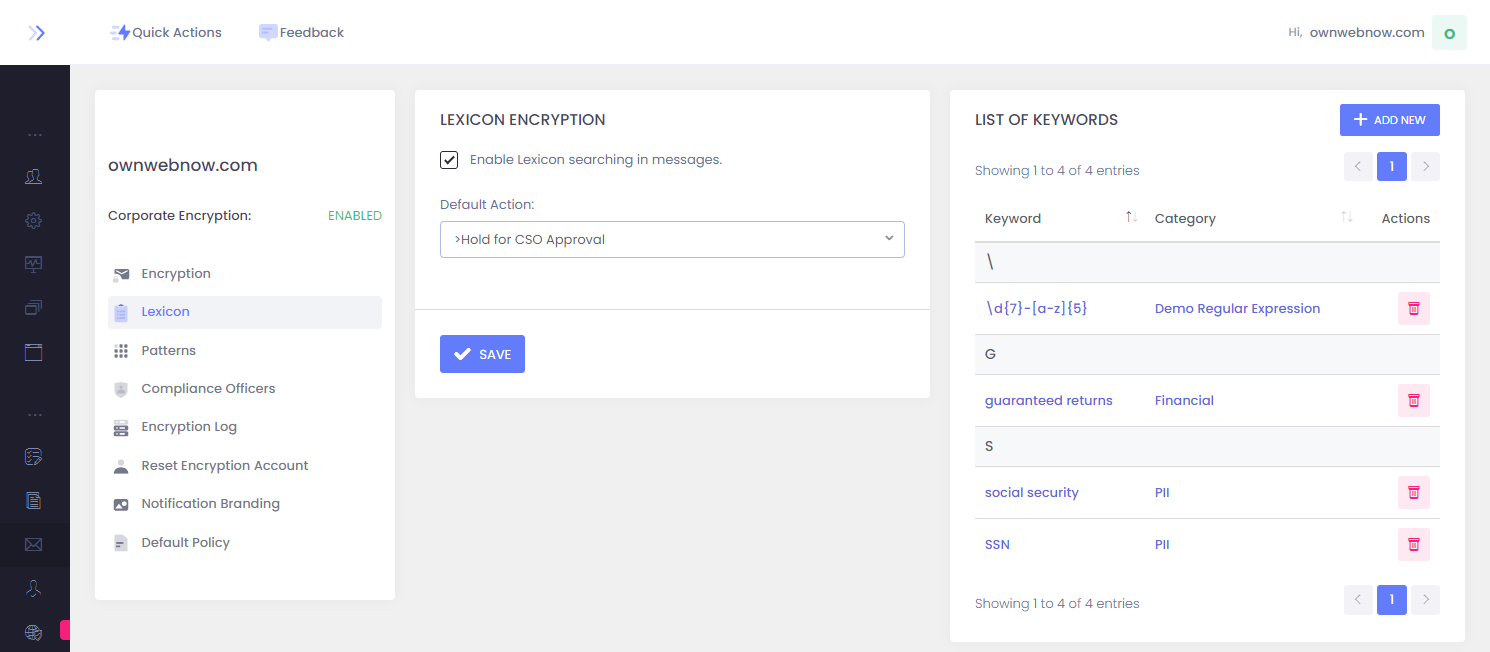 Lexicon enables Compliance Officers to provide a defined dictionary of terms (words or sentences) to scan all sent messages for. If ExchangeDefender detects a word defined in the lexicon, it will automatically apply the desired policy.