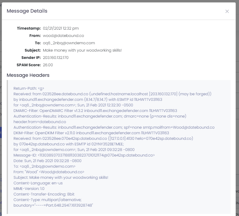 The Message Details screen contains everything we have on the message in question. Message Headers are individual message headers that are applied at every hop your email makes from your mail software to your mail server, and finally through us. These headers contain valuable information about the message structure, path, attachments, etc.