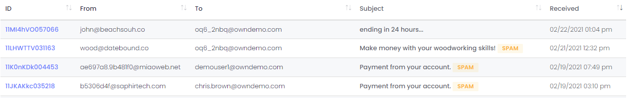 The first field on the left (ID) is the unique ExchangeDefender Message ID that helps us locate unique SMTP transaction logs associated with the message. Clicking on the message ID will show you the email message headers and the SMTP transaction logs.